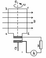 (15分).交流发电机模型的矩形线圈abcd在匀强磁场中,绕OO’轴匀速转动,线圈共有n匝,线圈面积S,线圈内阻为r ,外电路电阻为R,磁感应强度是B,线圈转动的角速度是