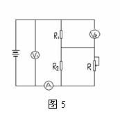如图5所示电路中,电源内阻不能忽略,当变阻器R的滑片向下移动时,电路中的电压表V1 、V2和电流表A的示数变化情况是:(