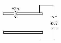 18、(16分)真空中有一对平行金属板,两板的电势差为60V。一个电荷为+2e的粒子从正极板的小孔进入电场,到达负极板(如图所示)。这个粒子在两极板间运动的过程中,电场力做了多少功?粒子获得的动能为多少?(不计重力)