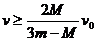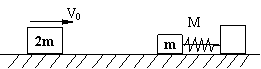 如图,总质量为M的大小两物体,静止在光滑水平面上,质量为m的小物体和大物体间有压缩着的弹簧,另有质量为2m的物体以V0速度向右冲来,为了防止冲撞,大物体将小物体发射出去,小物体和冲来的物体碰撞后粘合在一起。问小物体发射的速度至少应多大,才能使它们不再碰撞?![]()