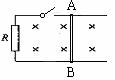 = 0.5T,导轨中串接的电阻R = 4Ω,垂直磁感线的导体AB长L = 0.4m,其电阻为1Ω,导体AB沿水平方向运动的速度为5m/s,则当电键打开时AB间的电势差为 V;当电键闭合时AB间的电势差为 V。