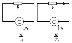 如图中甲图为一台内阻及损耗均不计的直流电机,定子的磁场恒定,电机转子线圈与一电阻R连接,电机转子的轴上绕有足够长的轻绳,绳下端悬挂一质量为m的物体,当重物以速率υ1匀速下落时,电路中的电流强度I=_ ___。若将一电动势为E,内阻不计的电源接入该电路内如图乙,将该电机作为电动机使用,当原重物匀速上升时,其回路内电流大小不变,其上升速率υ2=__ __。
