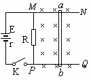 如图所示,MN、PQ为水平放置的金属导轨,导轨间距L=10cm,直导线ab与导轨垂直放置,其电阻为0.4Ω,导轨所在区域处在匀强磁场中,磁场方向竖直向下,磁感应强度B=0.2T,电池电动势E=1.5V,内电阻r=0.18Ω,电阻R=1.6Ω,电键K接通后ab仍静止不动,求ab所受的摩擦力的大小和方向。