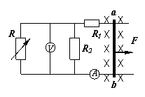 9、(22分)如图所示,在两条平行的光滑导轨上,一导体棒ab(导轨与导体棒的电阻不计)可在导轨上无摩擦的滑动。匀强磁场的方向如图中所示,已知R1=5Ω,R2=6Ω,伏特表量程为0-10V,安培表量程为0-3A(电表内阻对电路的影响不计),求