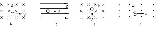 9、如下图所示的磁场方向和带电粒子的运动方向,可得出带电粒子受力方向向右的是: A、a图