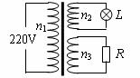 (15分)理想变压器初级线圈和两个次级线圈的匝数分别为n1=1760匝、n2=288匝、n3=8000匝,电源电压为U1=220V。n2上连接的灯泡的实际功率为36W,测得初级线圈的电流为I1=0.3A,求通过n3的负载R的电流I3。