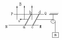 34.(7分) 如图示,两条固定的光滑的平行长金属导轨PQ和MN相距L=2m,电阻忽略不计。两导轨在同一水平面上,导轨上放有两根电阻均为r=1Ω且与导轨垂直的细金属杆ab和cd,处在竖直向上的磁感强度B=0.5T的匀强磁场中,杆cd系一细绳,绳跨过定滑轮与一质量m=1kg的重物相连,不计绳与滑轮以及滑轮与轴间的摩擦。现使杆ab向左以速度v作匀速直线运动,此时cd杆和重物m均处于静止状态,求ab杆的速度v。(g=10m/s2)