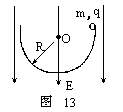 20.如图13所示,一个半径为R的绝缘光滑半圆环,竖直放在场强为E的匀强电场中,电场方向竖直向下.在环壁边缘处有一质量为m,带有正电荷q的小球,由静止开始下滑,求小球经过最低点时对环底的压力.