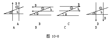 例4 质量为m的通电导体棒ab置于倾角为θ的导轨上,如图10-7所示。已知导体与导轨间的动摩擦因数为μ,在图10-8所加各种磁场中,导体均静止,则导体与导轨间摩擦力为零的可能情况是: