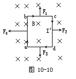 利用左手定则判断。先画出直线电流的磁场在矩形线圈所在处的磁感线分布,由右手螺旋定则确定其磁感线的方向垂直纸面向里,如图10-10所示。线圈的四条边所受安培力的方向由左手定则判定。其中F1与F3相互平衡,因ab边所在处的磁场比cd边所在处的强,故F4>F2。由此可知矩形线圈abcd所受安培力的合力的方向向左,它将加速向左运动而与导体AB靠拢。