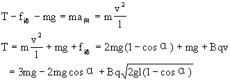 例8 摆长为ι的单摆在匀强磁场中摆动,摆动平面与磁场方向垂直,如图10-14所示。摆动中摆线始终绷紧,若摆球带正电,电量为q,质量为m,磁感应强度为B,当球从最高处摆到最低处时,摆线上的拉力T多大?