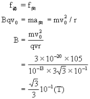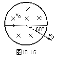 例9 如图10-16所示,带负电的粒子垂直磁场方向进入圆形匀强磁场区域,出磁场时速度偏离原方向60°角,已知带电粒子质量m=3×10-20kg,电量q=10-13C,速度v0=105m/s,磁场区域的半径R=3×10-1m,不计重力,求磁场的磁感应强度。