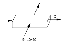 例12 如图10-20所示,一块铜块左右两面接入电路中。有电流I自左向右流过铜块,当一磁感应强度为B的匀强磁场垂直前表面穿入铜块,从后表面垂直穿出时,在铜块上、下两面之间产生电势差,若铜块前、后两面间距为d,上、下两面间距为l。铜块单位体积内的自由电子数为n,电子电量为e,求铜板上、下两面之间的电势差U为多少?并说明哪个面的电势高。