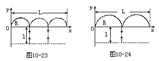 粒子在磁场中的运动为匀速圆周运动,在电场中的运动为匀变速直线运动。画出粒子运动的过程草图10-24。根据这张图可知粒子在磁场中运动半个周期后第一次通过x轴进入电场,做匀减速运动至速度为零,再反方向做匀加速直线运动,以原来的速度大小反方向进入磁场。这就是第二次进入磁场,接着粒子在磁场中做圆周运动,半个周期后第三次通过x轴。