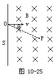 例14 一个负离子的质量为m,电量大小为q,以速度v0垂直于屏S经过小孔O射入存在着匀强磁场的真空室中,如图10-25所示。磁感应强度B方向与离子的初速度方向垂直,并垂直于纸面向里。如果离子进入磁场后经过时间t到这位置P,证明:直线OP与离子入射方向之间的夹角θ跟t