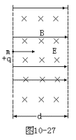 例15 图10-27为方向相互垂直的匀强电场和匀强磁场区域。电场强度为E,磁感强度为B,复合场的水平宽度为d,竖直方向足够长。现有一束电量为+q、质量为m初速度各不相同的粒子沿电场方向进入场区,求能逸出场区的粒子的动能增量ΔEk。