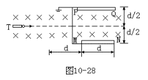 例16 初速度为零的离子经过电势差为U的电场加速后,从离子枪T中水平射出,与离子枪相距d处有两平行金属板MN和PQ,整个空间存在一磁感强度为B的匀强磁场如图10-28所示。不考虑重力的作用,荷质比q/m(q,m分别为离子的带电量与质量),应在什么范围内,离子才能打到金属板上?