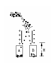 如图是静电分选器的原理示意图,将磷酸盐和石英的混合颗粒由传送带送至两个竖直的带电平行板上方,颗粒经漏斗从电场区域中央处开始下落,经分选后的颗粒分别装入A、B桶中。混合颗粒离开漏斗进入电场时磷酸盐颗粒带正电,石英颗粒带负电,所有颗粒所带的电量与质量之比均为10-5C/kg。若已知两板间的距离为10cm,两板的竖直高度为50cm,设颗粒进入电场时的初速度为零,颗粒间相互作用不计。如果要求两种颗粒离开两极板间的电场区域时有最大的偏转量且又恰好不接触到极板。(1)两极板间所加的电压应多大?(2)若带电平行板的下端距A,B桶底的高度为H=1.3m,求颗粒落至桶底时速度的大小。