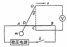 16.(11分)如图14-13所示是一种悬球式加速度仪,它可以用来测定沿水平轨道运动的列车的加速度,金属球的质量为m,它系在金属球的下端,金属丝的上端悬挂在O点,AB是一根长为L的均匀电阻丝,其阻值为R,金属丝与电阻丝接触良好,摩擦不计。电阻丝的中点C焊接一根导线,从O点也引出一根导线,两线之间接入一个电压表V(金属丝和导线电阻不计)。图中虚线OC与AB垂直,且OC=h。电阻丝AB接在电压为U的直流稳压电源上,整个装置固定在列车中且AB沿着车前进的方向,列车静止时金属丝呈坚直状态,当列车加速或前进时,金属丝将偏离竖直方向,从电压表V的读数变化可以测出加速度的大小。