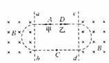 8.如图19-6所示,ab和cd为两条相距较远的平行直线,ab的左边和cd的右边都有感应强度为B、方向垂直纸面向里的匀强磁场,虚线是由两个相同的半圆和半圆相切的两条线段组成,甲、乙的初速度开始向两边运动,轨迹正好和虚线重合,它们在C点碰撞后结为一体向右运动,若整个过程中重力不计,则下列说法正确的是( )