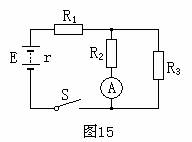 33.(6分)在图15所示的电路中,电阻R1=9Ω,R2=15Ω,R3=30Ω,电池组的电动势E=12伏,内电阻r=1Ω,求电流表的读数.