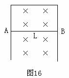34.(8分)如图16所示,一匀强磁场的磁感应强度B=0.1T,方向沿水平方向,在垂直于磁场方向的竖直平面内放一个U型光滑金属框,金属棒AB与U型框接触良好,可以自由上 下滑动,且始终保持水平.若AB棒的质量为m=0.2g,长L=0.1m,电阻R=0.2Ω,其它电阻不计,取g=10m/s2.