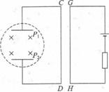 如图所示,连接平行金属板P1和P2(板垂直纸面)的导线的一部分CD和另一连接电池的回路的一部分导体GH平行,CD和GH均在纸平面内,金属板置于磁场中,磁场方向垂直纸面向里,当一束等离子体射入两金属板之间时,CD段导线将受到力的作用,则