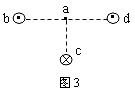 如图3所示,三根长直导线中的电流强度相同,导线b和d的电流方向垂直纸面向外,导线c的电流方向垂直纸面向里,a点为bd连线的中点,ac垂直bd,且ab=ad=ac,则a点处的磁感应强度的方向为( )