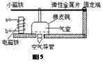 8、人们常常用充气泵为鱼缸内的水补充氧气,如图5是一种利用电磁原理制作的充气泵的结构示意图。其工作原理类似打点计时器。当电流从电磁铁的接线柱a流入,吸引小磁铁向下运动时,以下选项中正确的是(