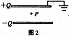 如图2所示,一平行板电容器充电后与电源断开,这时龟容器的带电量为Q,P是电容器内一点,电容器的上板与大地相连,下列说法正确的是( )