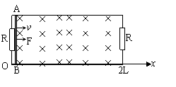 。一光滑导体棒AB与短边平行且与长边接触良好,电阻也是R。开始时导体棒处于x=0处,从t=0时刻起,导体棒AB在沿x方向的力F作用下作速度为v的匀速运动,求: