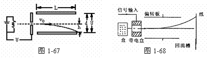 1.如图1-67所示,是一个说明示波管工作原理的示意图,电子经电压U1加速后以速度v0垂直进入偏转电场,离开电场时的偏转量是h,两平行板间距离为d,电势差是U2,板长是L.为提高示波管的灵敏度(每单位电压引起的偏转量)可采用以下哪些方法 ( )