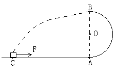 如图所示,半径R = 0.4m的光滑半圆轨道与粗糙的水平面相切于A点,质量为 m = 1kg的小物体(可视为质点)在水平拉力F的作用下,从C点运动到A点,物体从A点进入半圆轨道的同时撤去外力F,物体沿半圆轨道通过最高点B后作平抛运动,正好落在C点,已知AC = 2m,F = 15N,g取10m/s2,试求: