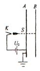 5、如图所示,一对竖直放置的平行金属板A、B构成电容器,电容为C。电容器的A板接地,且中间有一个小孔S,一个被加热的灯丝K与S位于同一水平线,从丝上可以不断地发射出电子,电子经过电压U0加速后通过小孔S沿水平方向射入A、B两极板间。设电子的质量为m,电荷量为e,电子从灯丝发射时的初速度不计。如果到达B板的电子都被B板吸收,且单位时间内射入电容器的电子数为n个,随着电子的射入,两极板间的电势差逐渐增加,最终使电子无法到达B板,求: