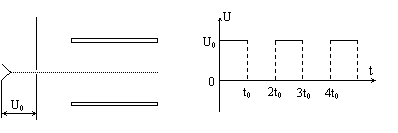 7.两块水平平行放置的导体板如图所示,大量电子(质量m、电量e)由静止开始,经电压为U0的电场加速后,连续不断地沿平行板的方向从两板正中间射入两板之间。当两板均不带电时,这些电子通过两板之间的时间为3t0;当在两板间加如图所示的周期为2t0,幅值恒为U0的周期性电压时,恰好能使所有电子均从两板间通过。问: ⑴这些电子通过两板之间后,侧向位移的最大值和最小值分别是多少?