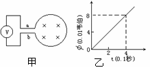 图中甲图所示的线圈为5匝,其端点a、b与电压表相连,线圈内磁通量变化规律如乙图所示,则a、b两点的电势高低及电压表读数为 ( )
