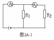 如右图2A-1所示电路,电源电压不变,已知:电阻R1的电阻值为1Ω,电阻R2的阻值为3Ω,则电流表 1 和电流表 2 的示数比为( )
