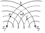 如图所示,S1、S2是两个相干波源,它们振动同步且振幅相同。实线和虚线分别表示在某一时刻它们所发出的波的波峰和波谷。关于图中所标的a、b、c、d四点,下列说法