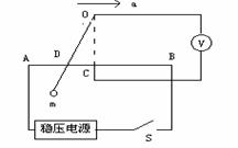 17、(10分)如图所示是一种悬球式加速度仪,它可以用来测定沿水平轨道运动的列车的加速度。金属球的质量为m,它系在金属丝的下端。金属丝的上端悬挂在O点。AB是一根长为L的均匀电阻丝,其阻值为R。金属丝与电阻丝接触良好,摩擦不计。电阻丝的中点C焊接一根导线,从O点也引出一根导线,两线之间接入一个电压表V,金属丝和导线的电阻不计。图中虚线OC与AB垂直,且OC=h .电阻丝AB接在电压为U的直流稳压电源上,整个装置固定在列车中使AB沿着车前进的方向。列车静止时金属丝呈竖直状态;当列车加速或减速前进时,金属丝将偏离竖直方向。从电压表V的读数变化可以测出加速度的大小。