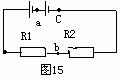 如图15所示,电池组是由两个电动势为2V、内阻为1Ω的电池串联而成,定值电阻R1=2Ω,R2=4Ω。求:
