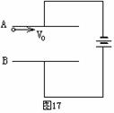 水平放置两块足够长的平行金属板A、B,两板间的距离为0.02m,两板间接入电压为182V的稳压电源,一电子以v0=4×107m/s的速度水平紧靠A板射入电场,如图17所示。电子电量为e=1.6×10-19C,质量m=9.1×10-31kg,试求: