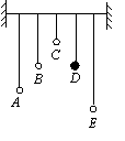 9.如图所示,一根张紧的水平弦线上有5个单摆,摆长分别为LA=3L/2,LB=LD=L,LC=L/2,LE=2L,质量最大的D摆先摆动,周期为T,则其余各单摆在弦线的驱动下摆动起来后( )