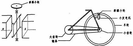 (13分)曾经流行过一种向自行车车头灯供电的小型交流发电机,图13为其结构示意图。图中N、S是一对固定的磁极,abcd为固定在转轴上的矩形线框,转轴过bc边中点、与ab边平行,它的一端有一半径r0=1.0cm的摩擦小轮,小轮与自行车车轮的边缘相接触,如图3所示。当车轮转动时,因摩擦而带动小轮转动,从而使线框在磁极间转动。设线框由N=800匝导线圈组成,每匝线圈的面积S=20cm2,磁极间的磁场可视作匀强磁场,磁感强度B=0.010T,自行车车轮的半径R1=35cm,小齿轮的半径R2=4.0cm,大齿轮的半径R3=10.0cm(见图14)。现从静止开始使大齿轮加速转动,问大齿轮的角速度为多大才能使发电机输出电压的有效值U=3.2V?(假定摩擦小轮与自行车轮之间无相对滑动)