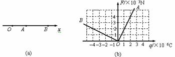 如图(a)所示,在x轴上有一个点电荷Q(图中未画出),A、B两点的坐标分别为0.2m和0.5m。放在A、B两点的检验电荷q1、q2受到的电场力跟检验电荷所带电量的关系如图(b)所示。则A点的电场强度大小为________N/C,点电荷Q的位置坐标为x=________m。