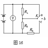 16、(10分)在如图16所示的电路中,R1=2 Ω,R2=R3=4 Ω,当电键K接a时,R2上消耗的电功率为4 W,当电键K接b时,电压表示数为4.5 V,试求: