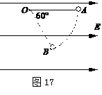 (10分)如图17所示,用长为l的绝缘细线拴一个质量为m、带电量为 +q的小球(可视为质点)后悬挂于O点,整个装置处于水平向右的匀强电场E中。将小球拉至悬线呈水平的位置A后,由静止开始将小球释放,小球从A点开始向下摆动,当悬线转过600角到达位置B时,速度恰好为零。求: