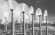 (8分)风能是一种环保型能源,我国的风力资源丰富,风力发电有广阔前景.风力发电是将风的动能转化为电能.如图所示为某地的风力发电站,共有N台风力发电机,设每台发电机风叶长均为L,叶片旋转所围成的圆面积内的所有风能转化为电能的效率为η,当地空气密度为ρ,平均风速为v.求该风力发电站总装机容量(发电总功率)P的数学表达式.