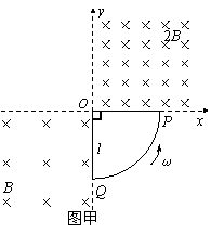 20.在图甲中,直角坐标系0xy的1、3象限内有匀强磁场,第1象限内的磁感应强度大小为2B,第3象限内的磁感应强度大小为B,磁感应强度的方向均垂直于纸面向里.现将半径为l,圆心角为900的扇形导线框OPQ以角速度ω绕O点在纸面内沿逆时针匀速转动,导线框回路电阻为R.