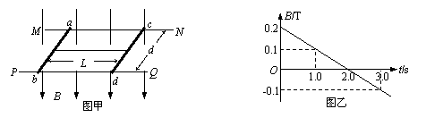 22.如图甲,平行导轨MN、PQ水平放置,电阻不计.两导轨间距d=10cm,导体棒ab、cd放在导轨上,并与导轨垂直.每根棒在导轨间的部分,电阻均为R=1.0Ω.用长为L=20cm的绝缘丝线将两棒系住.整个装置处在匀强磁场中.t=0的时刻,磁场方向竖直向下,丝线刚好处于未被拉伸的自然状态.此后,磁感应强度B随时间t的变化如图乙所示.不计感应电流磁场的影响.整个过程丝线未被拉断.求: