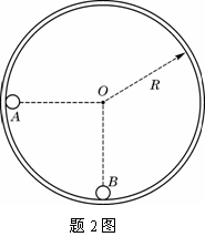 如题2图,半径为R的光滑圆形轨道固定在竖直面内。小球A、B质量分别为m、βm(β为待定系数)。A球从工边与圆心等高处由静止开始沿轨道下滑,与静止于轨道最低点的B球相撞,碰撞后A、B球能达到的最大高度均为